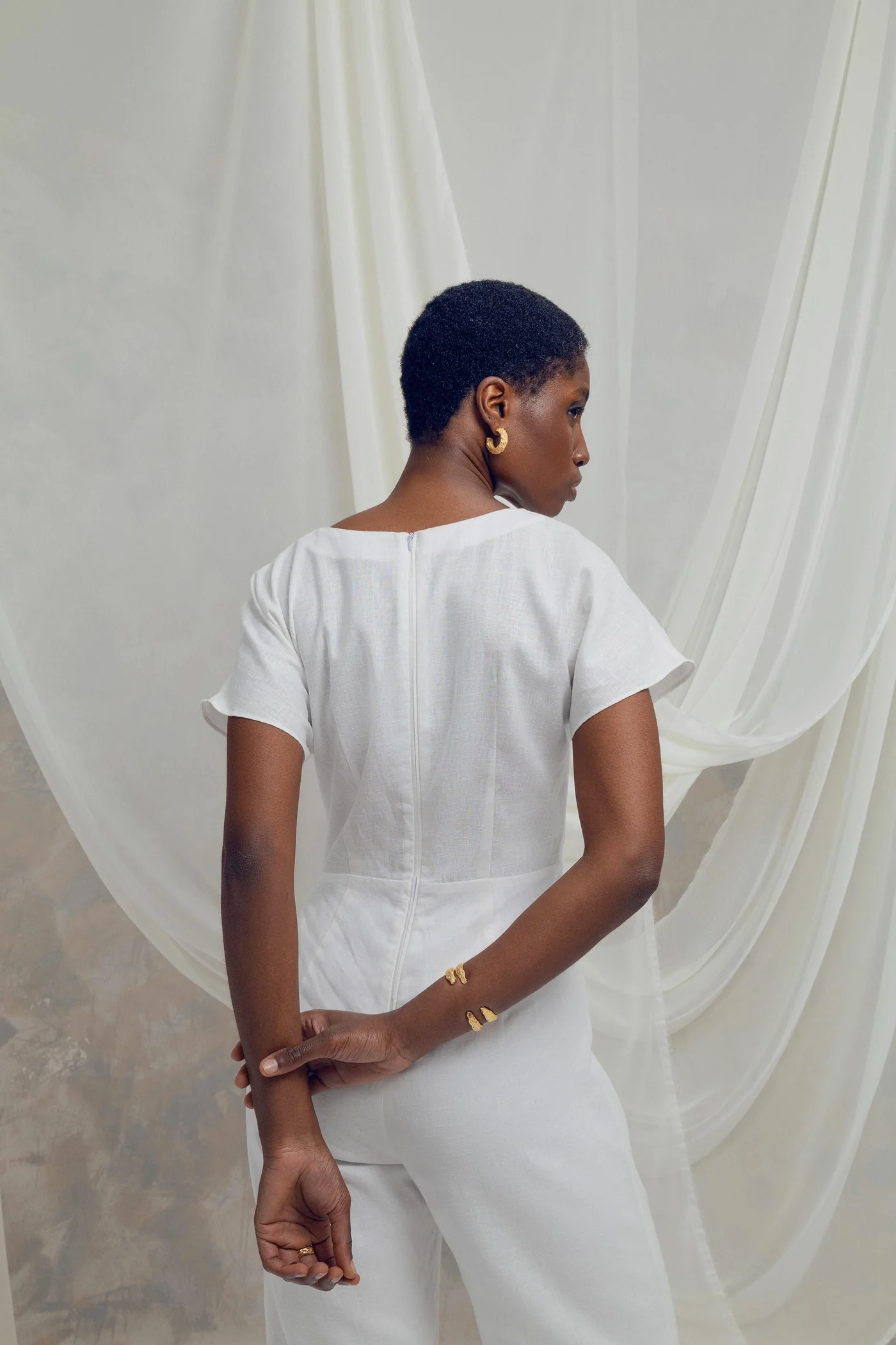 Luana añade el toque justo de opulencia con su broche dorado estratégicamente colocado. Faride comprende que el lujo verdadero reside en los detalles: el blanco impecable actúa como lienzo mientras el broche captura luz y miradas. Este vestido entiende el balance perfecto entre minimalismo y ornamento, creando presencia sofisticada sin caer en excesos. Para la mujer que sabe exactamente cuándo brillar.