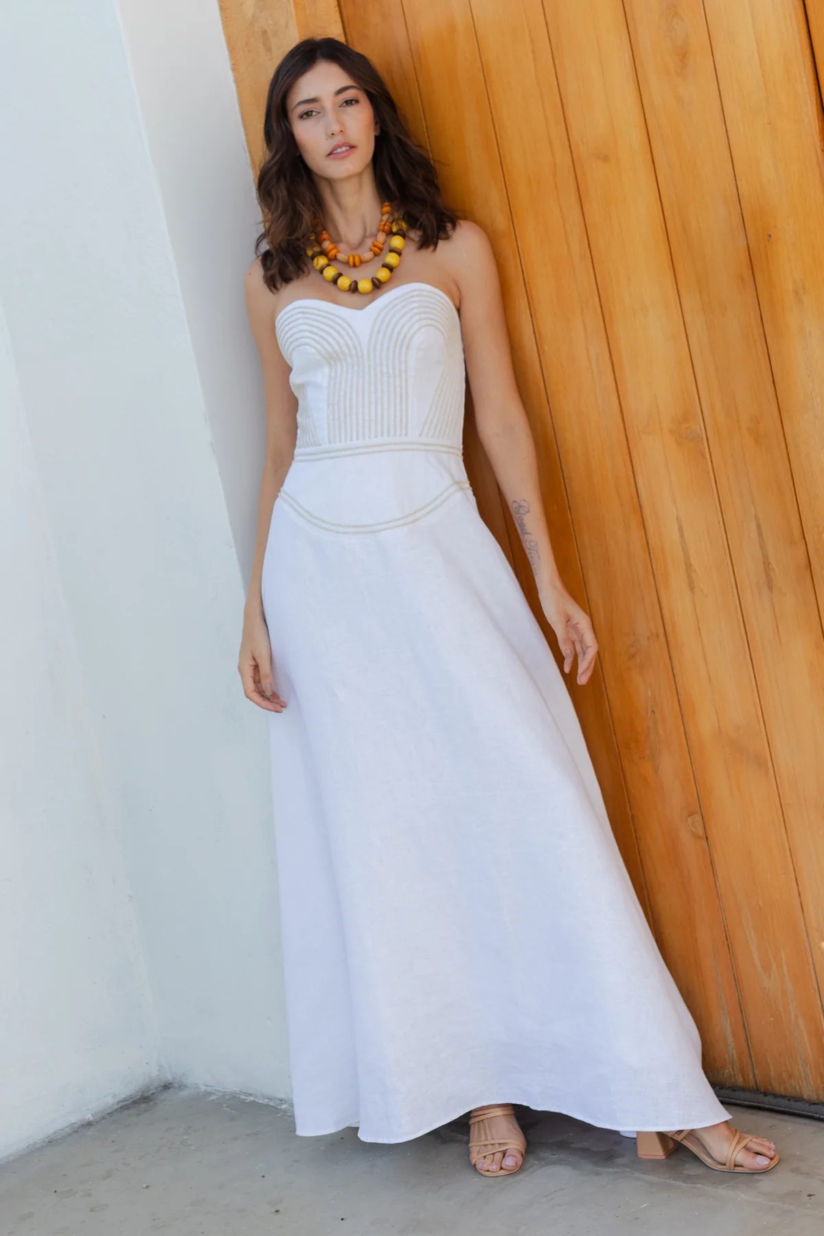 Teresa celebra la audacia de los hombros descubiertos con elegancia refinada. Faride diseña este strapless en blanco que sostiene con estructura invisible, permitiendo movimiento sin sacrificar seguridad. El corte sin tirantes libera la silueta mientras el color puro intensifica la presencia. Para momentos donde deseas que tu piel respire y tu estilo hable por sí solo. Sensualidad arquitectónica en equilibrio perfecto.